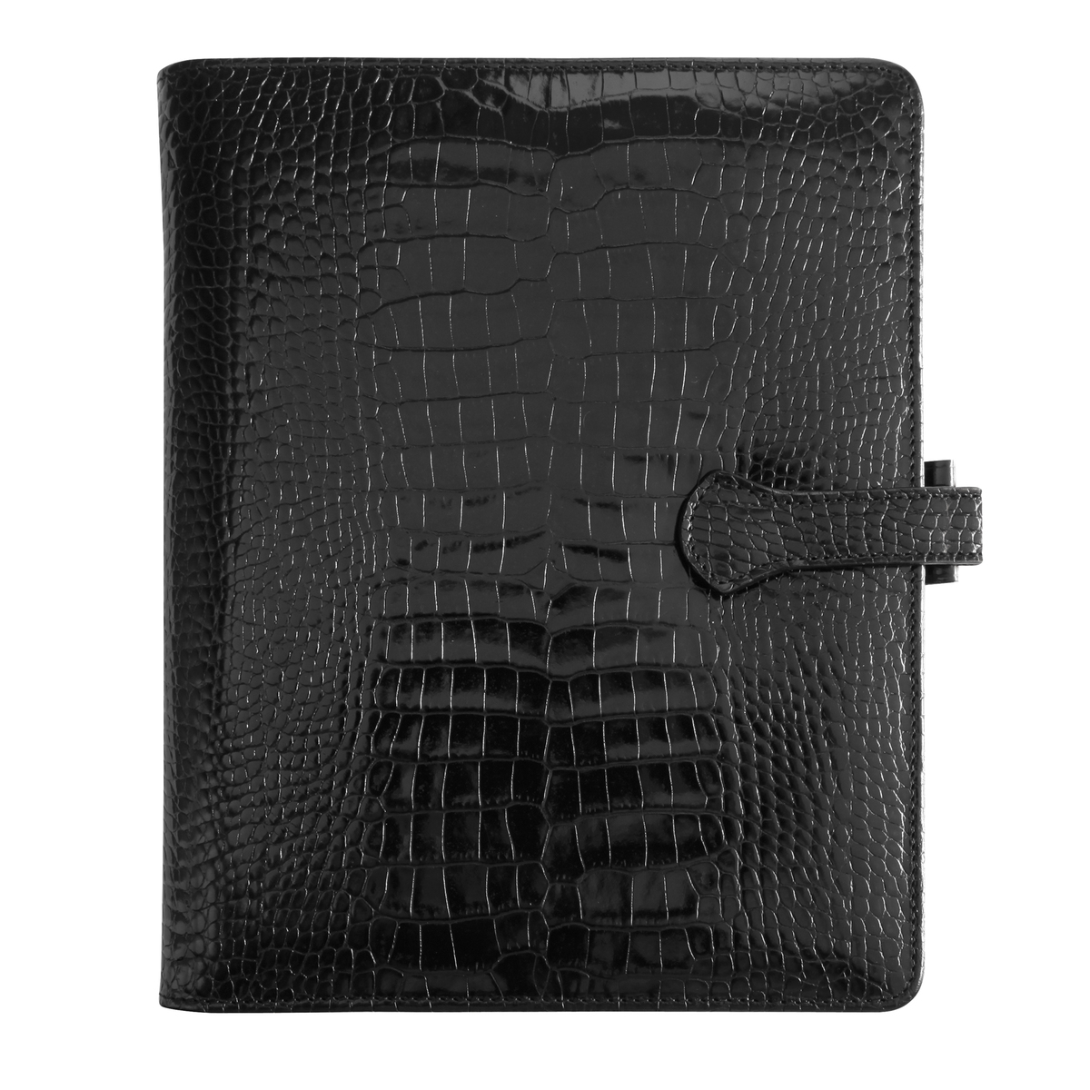 Poche plate à l'intérieur, livré avec un bloc. Cuir de veau pleine fleur. Jeu d'écailles à effet croco.