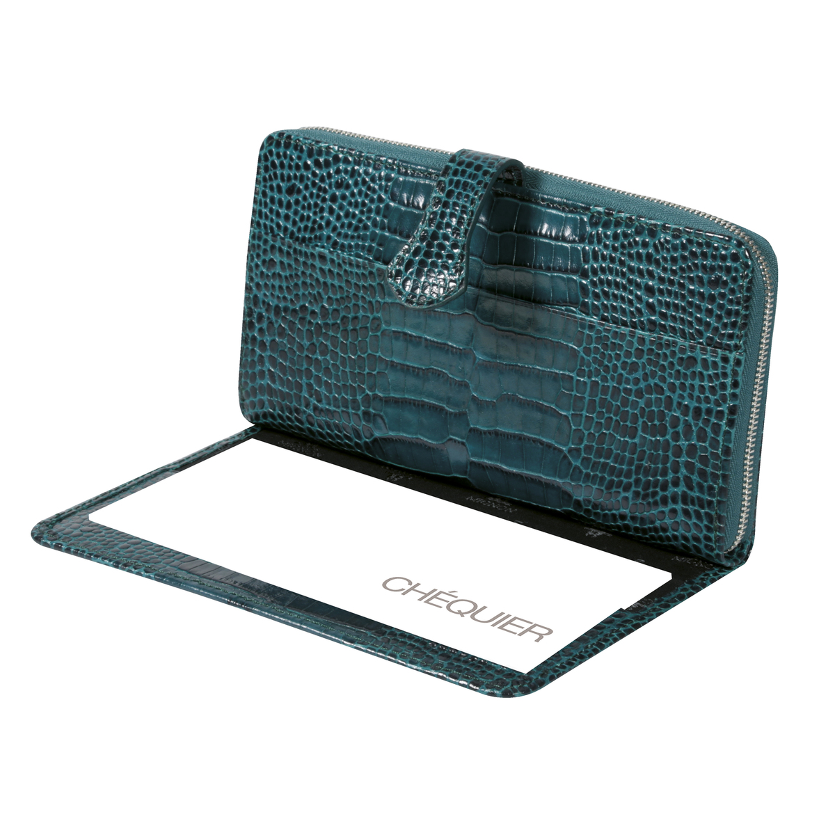 Pratique et compact, le chéquier en plus. Intérieur : poche zippée pour la monnaie, poches pour cartes et papiers. Emplacement pour chéquier. Dos : petite poche zippée. Format 105x200 mm