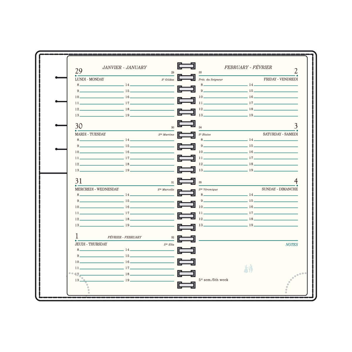 Recharge calendrier 2026 pour agenda Mignon reliure spiralée Format AS16 (H: 16cm). Une semaine sur 1 page.
