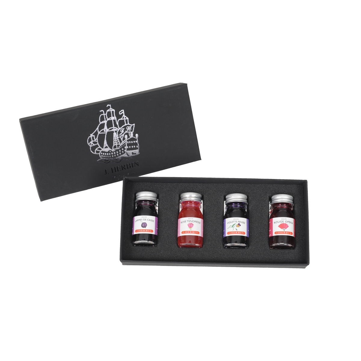 Coffret comprenant 4 flacons d'encre J. Herbin : Violette pensée, Larme de Cassis, Rose tendresse, Rouge Opéra. Une encre pour stylo est un subtil équilibre entre la retenue sur la plume et la dépose sur le papier. Tantôt lumineuse, discrète ou intense, l'encre couchée sur le papier doit rester stable avec le temps. Les encres H. Herbin sont principalement composées d'eau, d'humectant afin de limiter le séchage au niveau de la plume et de conservateur pour préserver leurs qualités dans le temps. Les colorants utilisés ont spécialement été sélectionnés pour offrir la gamme de couleur la plus riche du marché.