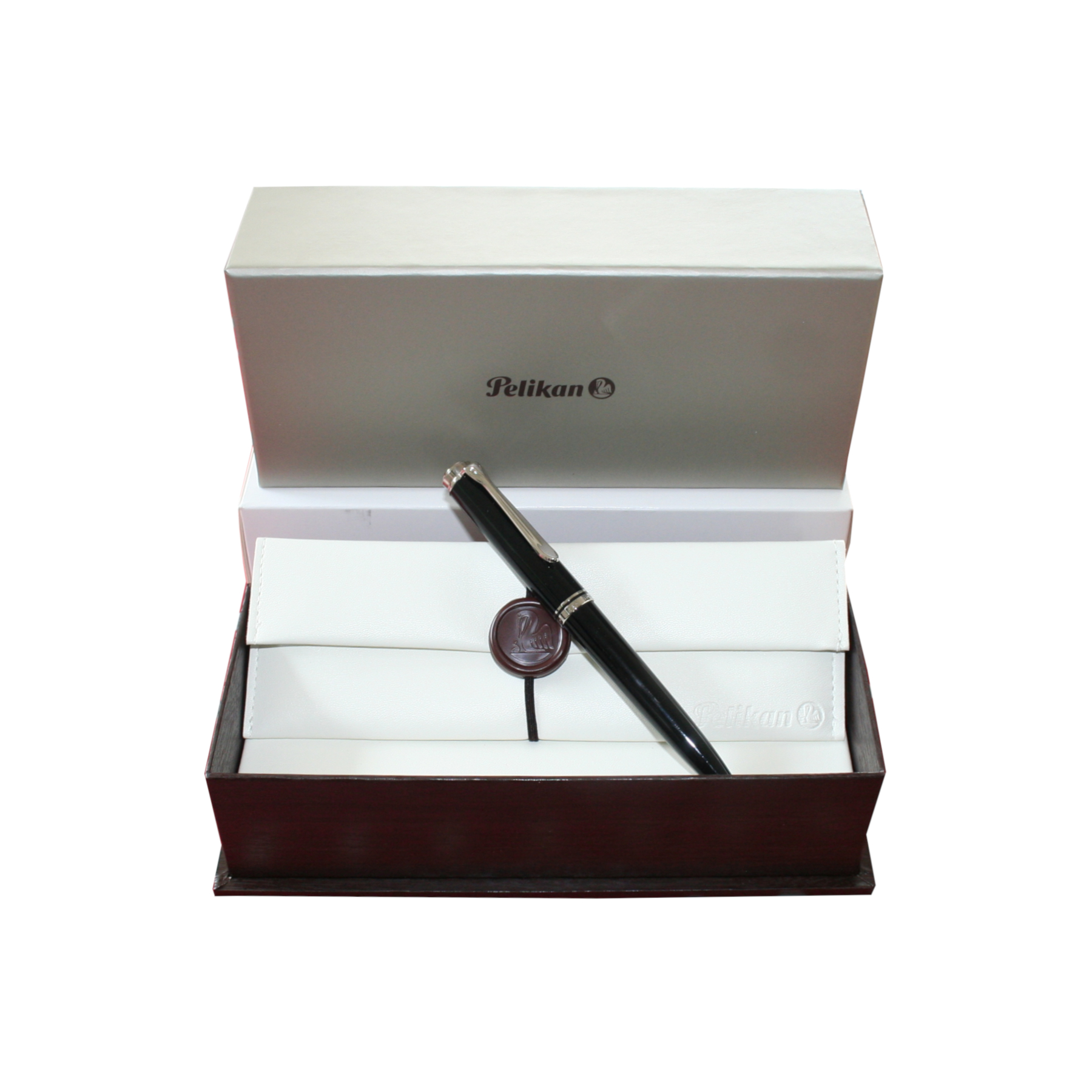 Magnifique porte-mine en résine noire attributs plaqués platine. Mines 0,7 mm. Livré dans son écrin luxe et son superbe étui en suédine.