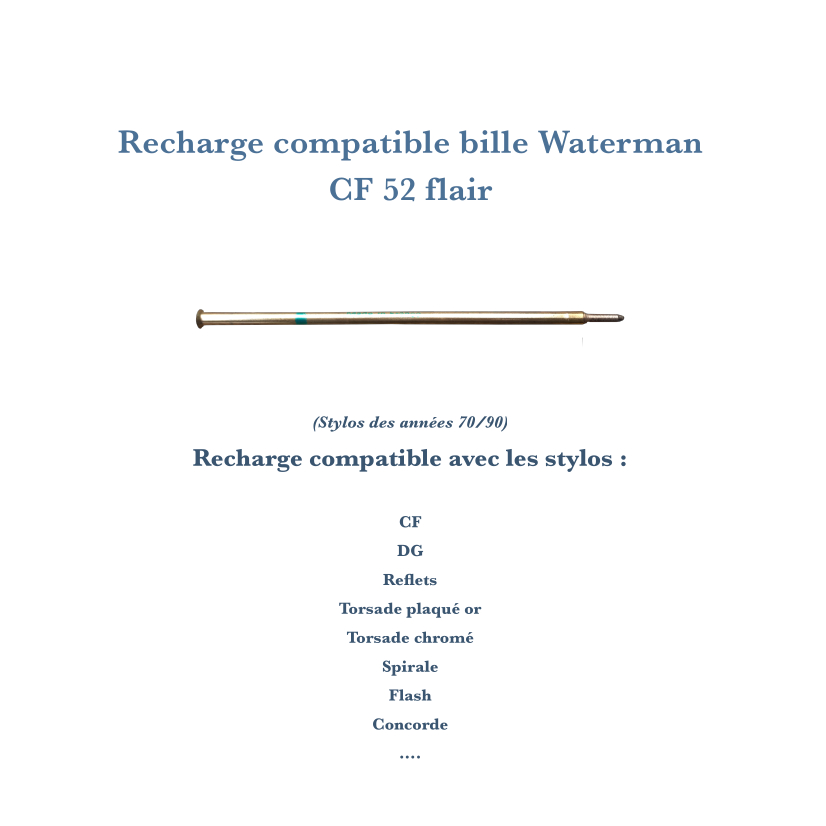 Recharge compatible pour stylo-billes Waterman des années 70/90. Mécanisme à rotation. Disponible en écriture bleue et noire.