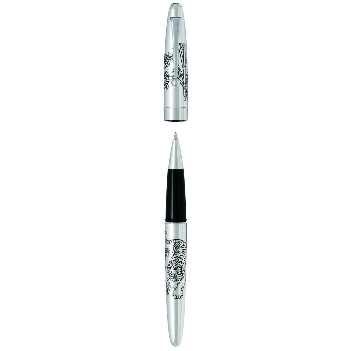 Roller. Argent massif. Orné de superbes motifs de tigres ciselés sur ses formes pleines et harmonieuses. Livré dans son écrin luxe et avec sa garantie Pilot.