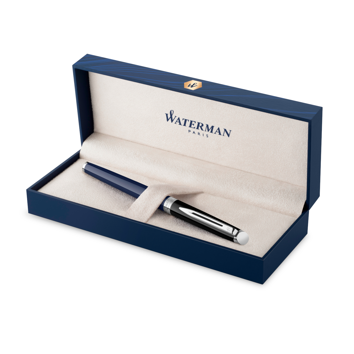 Waterman Hémisphère Stylo Roller, Laque Noire et Bleue avec attributs Palladium Pointe Fine. Un stylo roller de caractère inspiré par le style coloré audacieux de cette saison, affichant une couleur raffinée et une silhouette fine. Corps Bleu avec Capuchon Noir, clip à double branche emblématique et finition plaqués palladium. Pointe de stylo roller fabriquée avec un savoir-faire exceptionnel et associée à de l’encre liquide pour un confort et une ergonomie absolus. Fabriqué en France, grâce au savoir-faire de Waterman et à plus de 130 ans d’expérience. Présenté dans un étui cadeau Waterman haut de gamme, le cadeau parfait à offrir ou à s’offrir.
