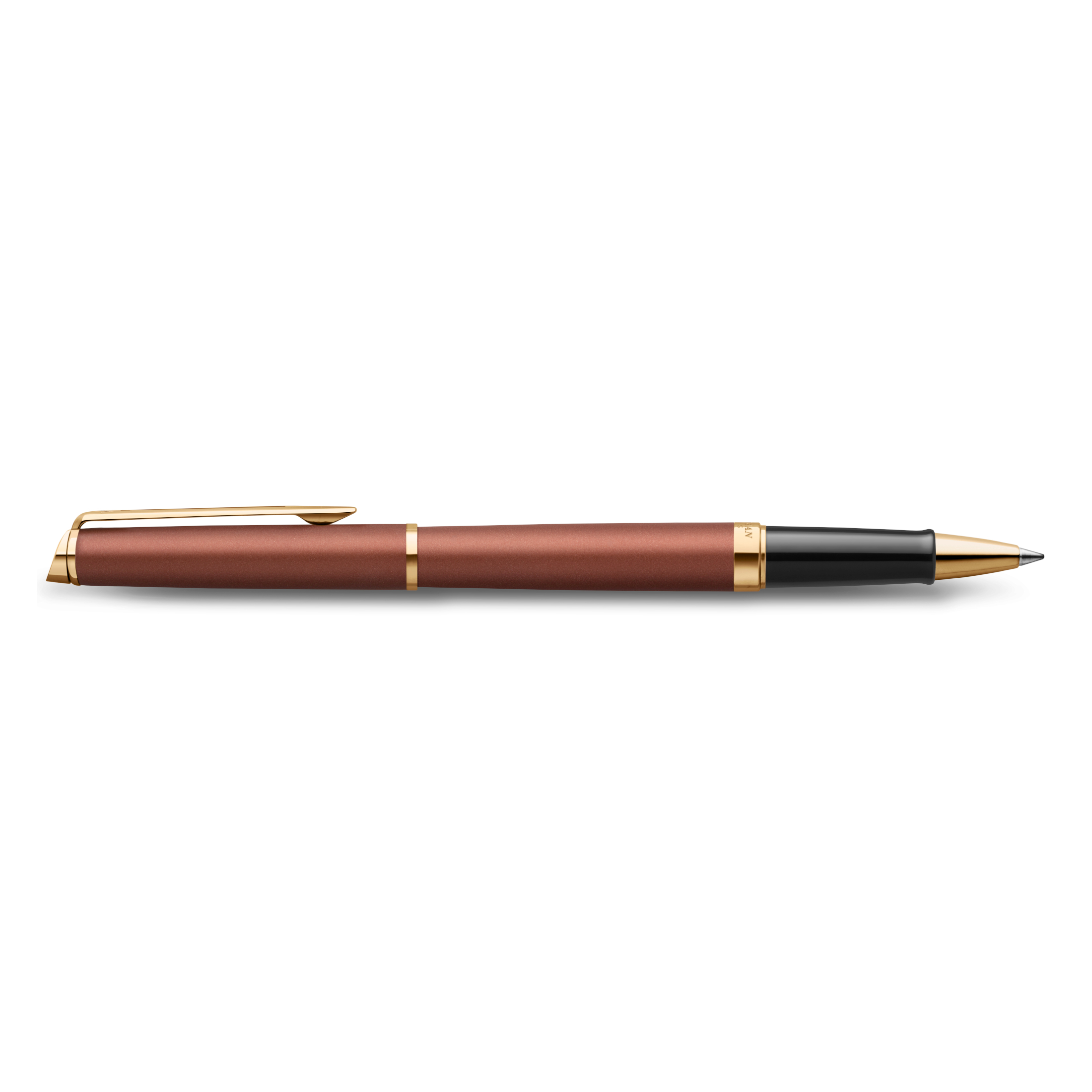 Corps et capuchon rouge cuivre finis en laque métallique, clip et finitions à double branche, recouverts d’un plaqué or clair