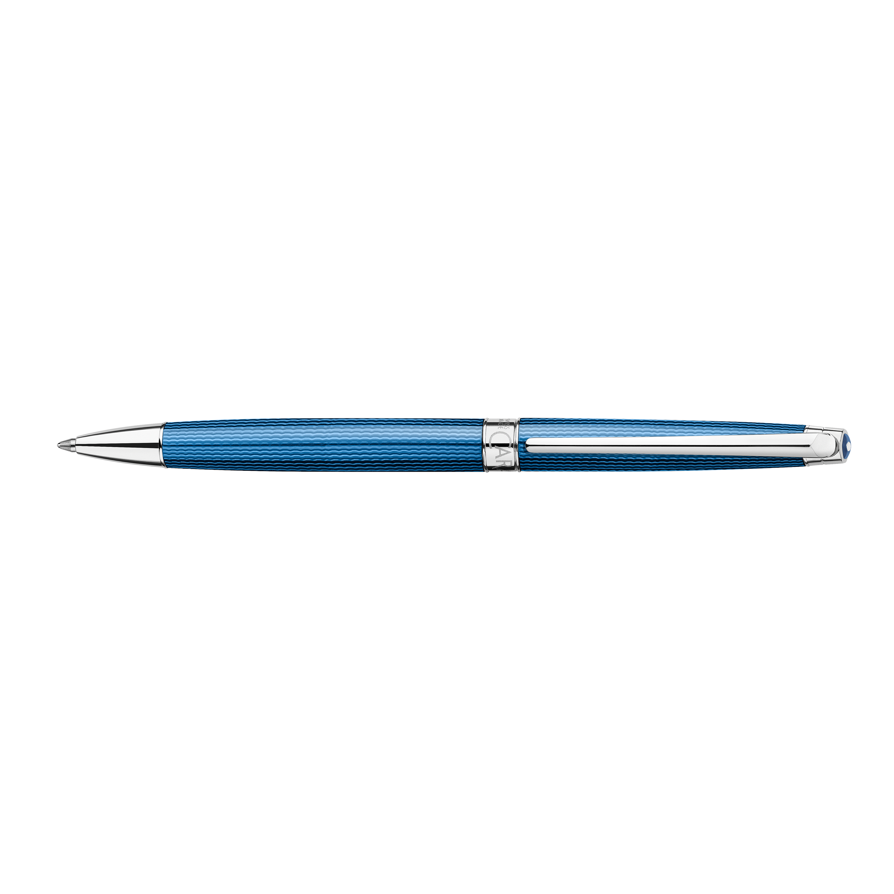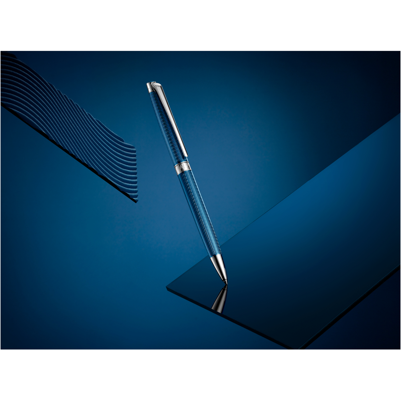 • Corps et capuchon recouverts d’une laque translucide bleue et d’un guillochage au motif « vagues »