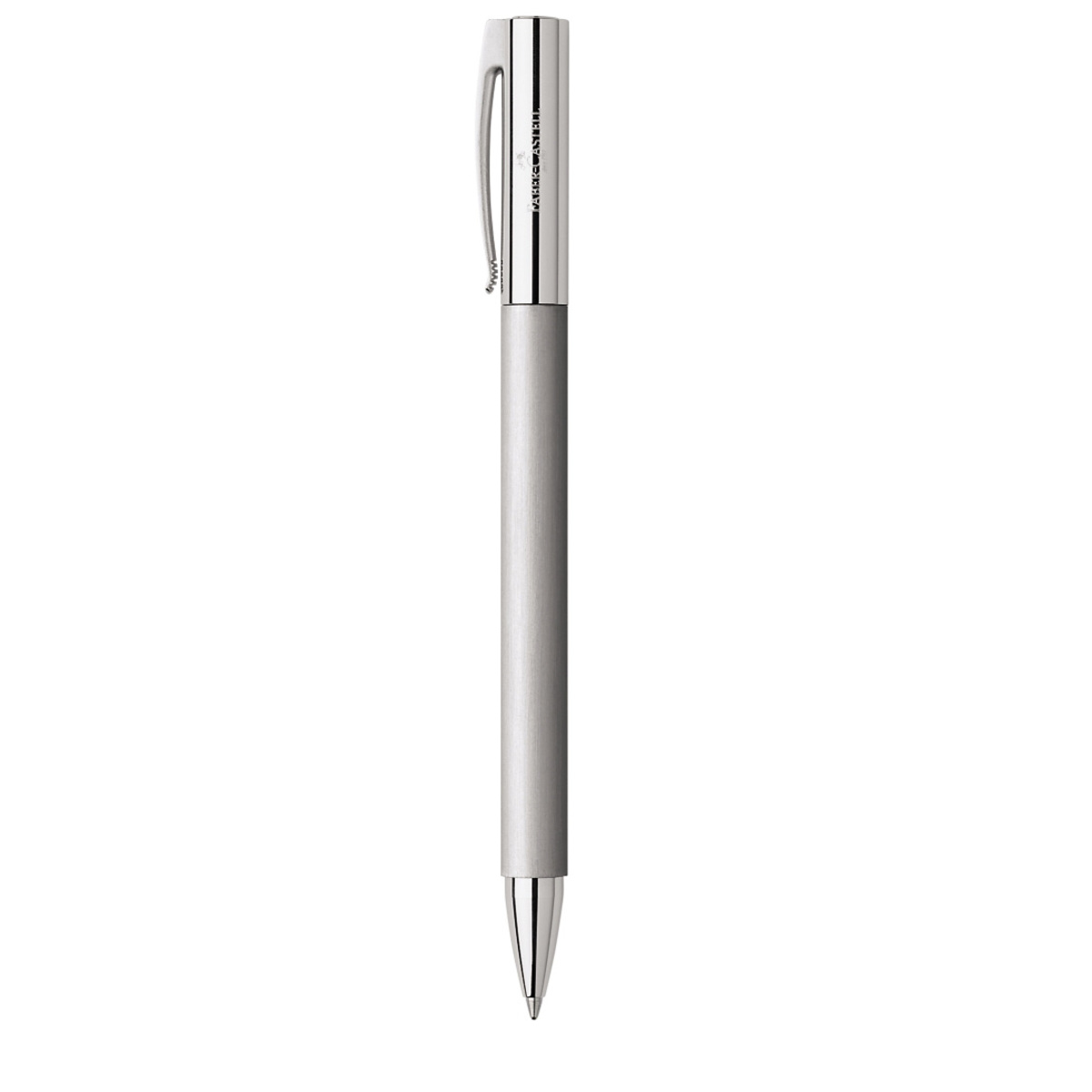 Stylo bille à mécanisme à rotation. Corps en métal brossé. Attributs chromés. Clip à ressort. Livré dans son écrin luxe et avec la garantie Faber-Castell.