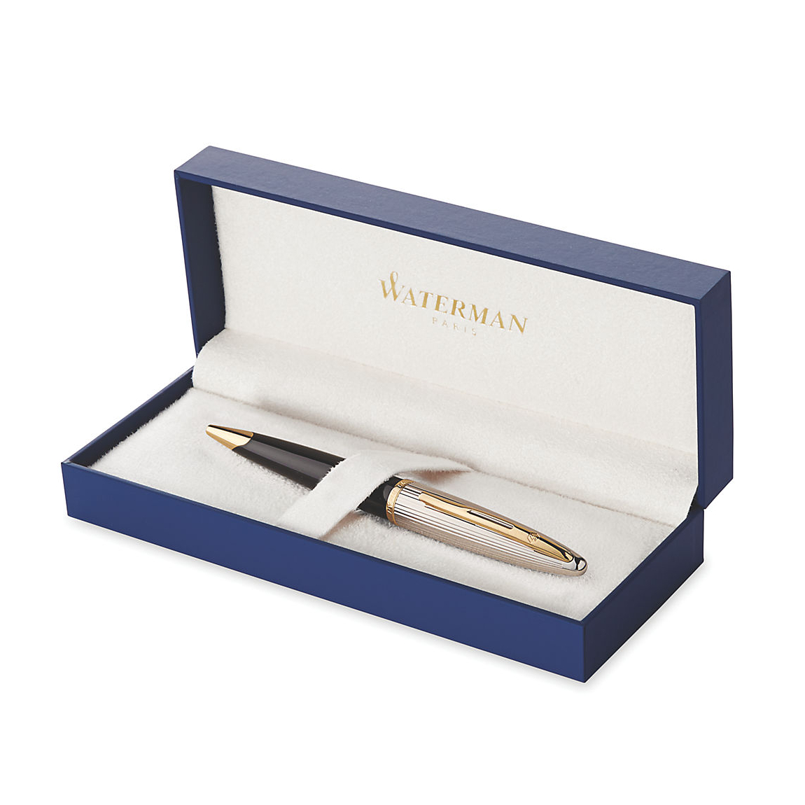 Stylo bille à mécanisme à rotation. Un instrument d'écriture raffiné et moderne. Attributs plaqués or. Capuchon plaqué argent. Livré dans son écrin luxe et avec sa garantie Waterman.