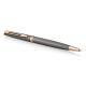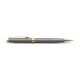 • Corps et capuchon gris pierre finis en laque métallique, clip et finitions à double branche, recouverts d’un plaqué or clair