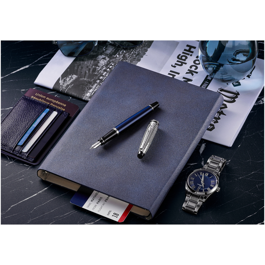 Offrant une expérience d’écriture harmonieuse, le stylo plume Expert Deluxe Bleu permet à chacun d’exprimer ses plus grandes ambitions et de souligner son sens du style. Inspirés des pièces de tailleur intemporelles portées par les gentlemen, la silhouette fuselée du corps et le motif à rayures finement gravé au laser sur le capuchon confèrent un style typiquement français au stylo, et donnent à son propriétaire assurance et maîtrise, quelle que soit l’occasion d’écrire. Le corps laqué bleu métallisé exclusif, le clip à branche double emblématique de Waterman et le capuchon biseauté s’associent parfaitement à l’élégant emblème W à boucle qui orne la plume en acier inoxydable. La collection Expert Deluxe – Le sceau de l'ambition