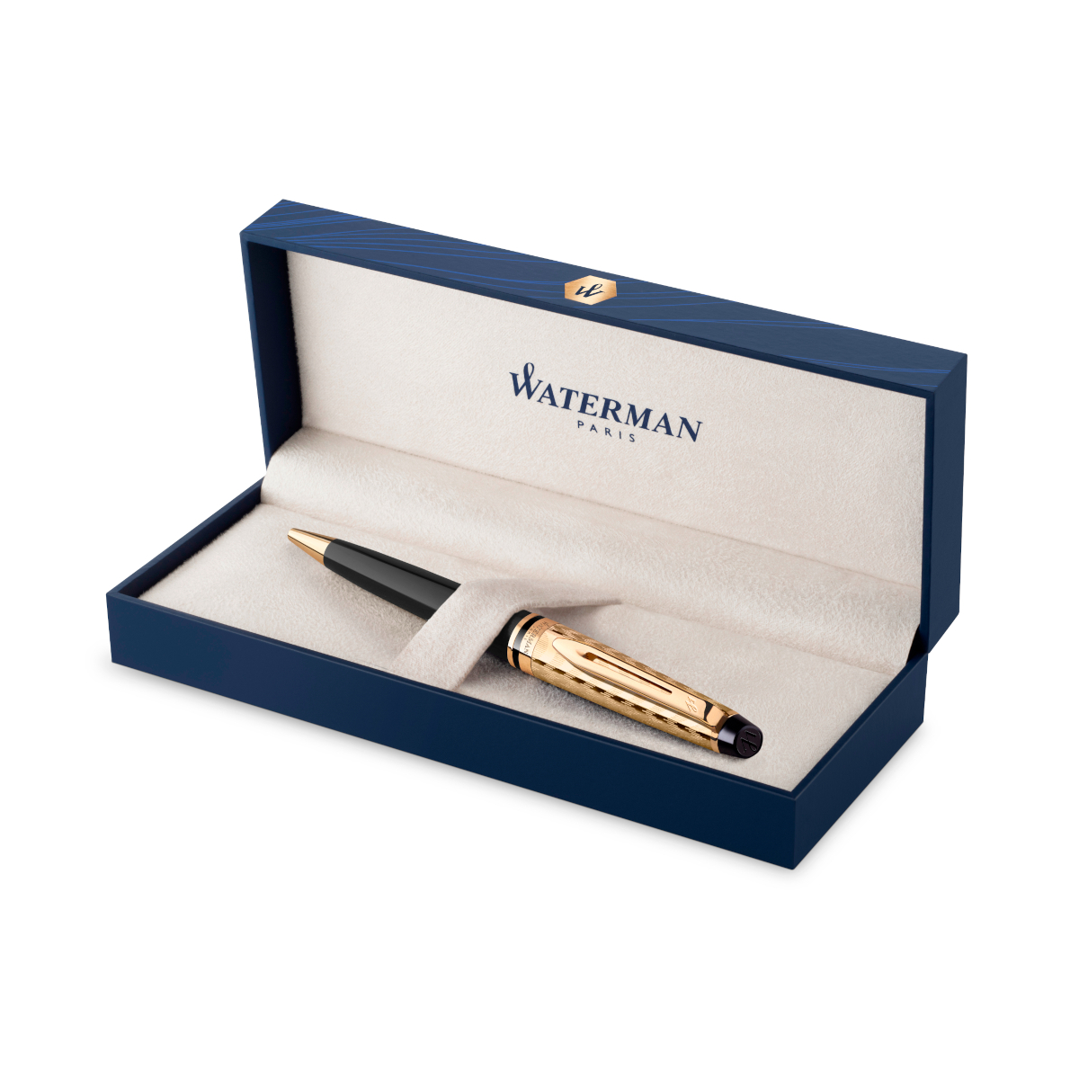 Stylo présenté avec soin dans un coffret cadeau Waterman Prestige, dont le design de vagues emblématique de Waterman offre la touche finale à cette luxueuse collection.