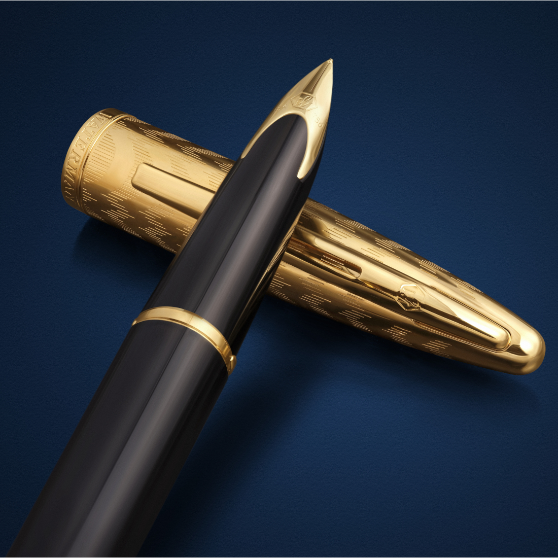 Les trésors d’artisanat grandioses de l’opéra inspirent le public depuis des siècles. C’est maintenant au tour de la collection Opera exclusive de Waterman. Les lignes arrondies raffinées du Carène et la laque noir intense de son corps s’accordent à la perfection avec son capuchon plaqué or exquis, au motif finement ciselé. L’hexagone Waterman classique ornant la plume en or 18 carats se marie parfaitement à l’emblématique clip à deux broches plaqué or du stylo plume.